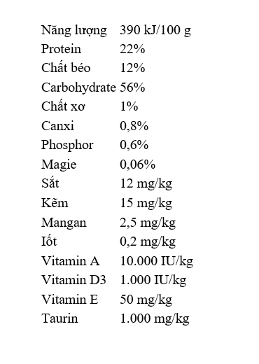 - Vitamin A, D3, E, taurin: Các chất dinh dưỡng cần thiết cho sức khỏe của mèo.