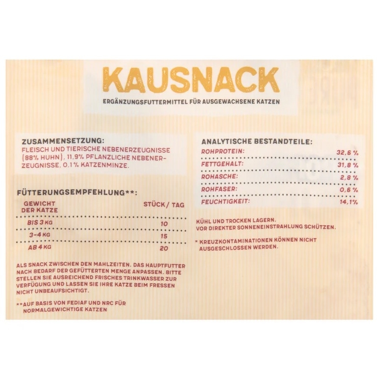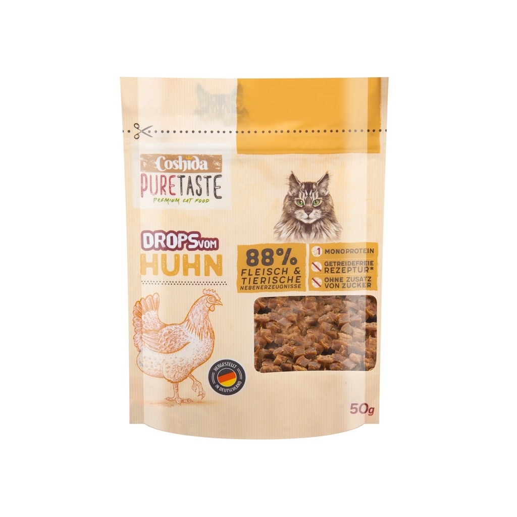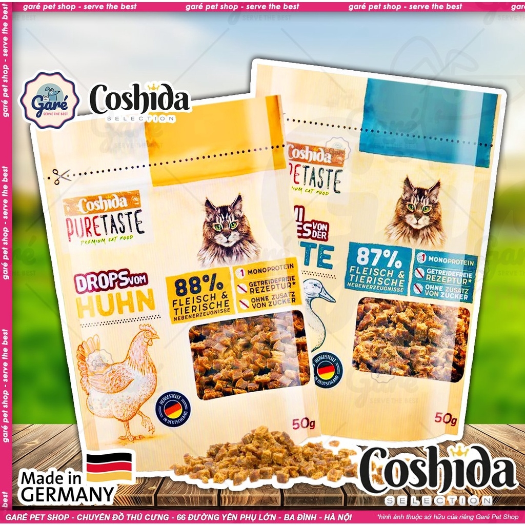 50gr - Bánh thưởng cho Mèo COSHIDA Pure Taste Katzensnack Mini Drops miếng nhỏ dạng mềm vị Thịt Gà, Thịt VịtThức ăn bổ sung cho mèo trưởng thànhGiàu thịt gà/thịt vịtCông thức không chứa hạtThành phầnThịt và phụ phẩm động vật: 88% thịt gà, 11,9% phụ phẩm thực vật, 0,1% catnipThành phần phân tíchProtein thô: 32,6%Hàm lượng chất béo: 31,8%Tro thô: 2,8%Xơ thô: 0,6%Độ ẩm: 14,1%Khuyến nghị cho ăn/ngàyTrọng lượng cơ thể lên đến 3 kg: 10 miếng3-4 kg trọng lượng cơ thể: 15 miếngTừ 4 kg trọng lượng cơ thể: 20 miếng-------------Garé Pet Shop - Chuyên đồ thú cưngSERVE THE BESTĐại lý Ủy quyền chính hãng phân phối các sản phẩm 5 ⭐⭐⭐⭐⭐ hàng đầu Thế giới dành cho thú cưng nhập khẩu trực tiếp từ Hoa Kỳ, Anh, Đức, Pháp, Italy, Canada,... #Tropiclean, #Gimborn, #Gimcat, #Gimdog, #Farmina, #Nutrience, #Earthborn, #ProPac, #Royal_Canin, #Instinct, #Grau, #Felina, #Sheba, #Brit, #Beaphar, #Feliway, #Virbac, #Canina, #Frontline, #Revolution...🏡 Số 66 Đường Yên Phụ đôi, Ba Đình, Hà Nội