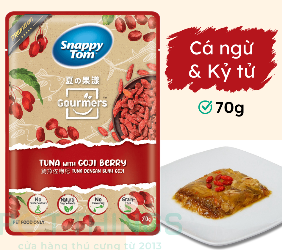 Pate Snappy Tom Gourmers làm từ cá ngừ thật kết hợp cùng các thực phẩm bổ dưỡng trong tự nhiên. Với 8 công thức cùng hương vị độc đáo sẽ cung cấp các chất dinh dưỡng thiết yếu để giúp cho mèo của bạn phát triển khỏe mạnh.