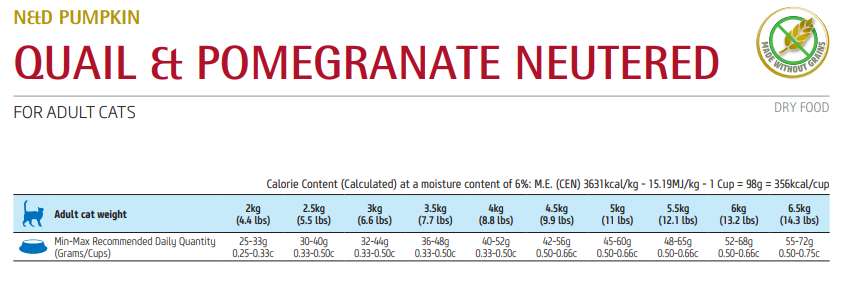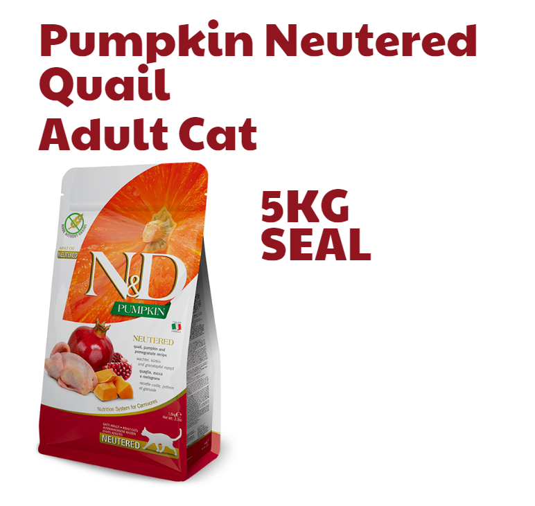 Hạt N&D Pumpkin Neutered Quail,Pumpkin and Pomegranate là thức ăn khô dành cho mèo trưởng thành đã được triệt sản, được sản xuất bởi thương hiệu N&D của Italy. Sản phẩm này được làm từ các nguyên liệu tươi, nguyên chất, không chứa ngũ cốc, gluten, màu nhân tạo, chất bảo quản, hương liệu tổng hợp.