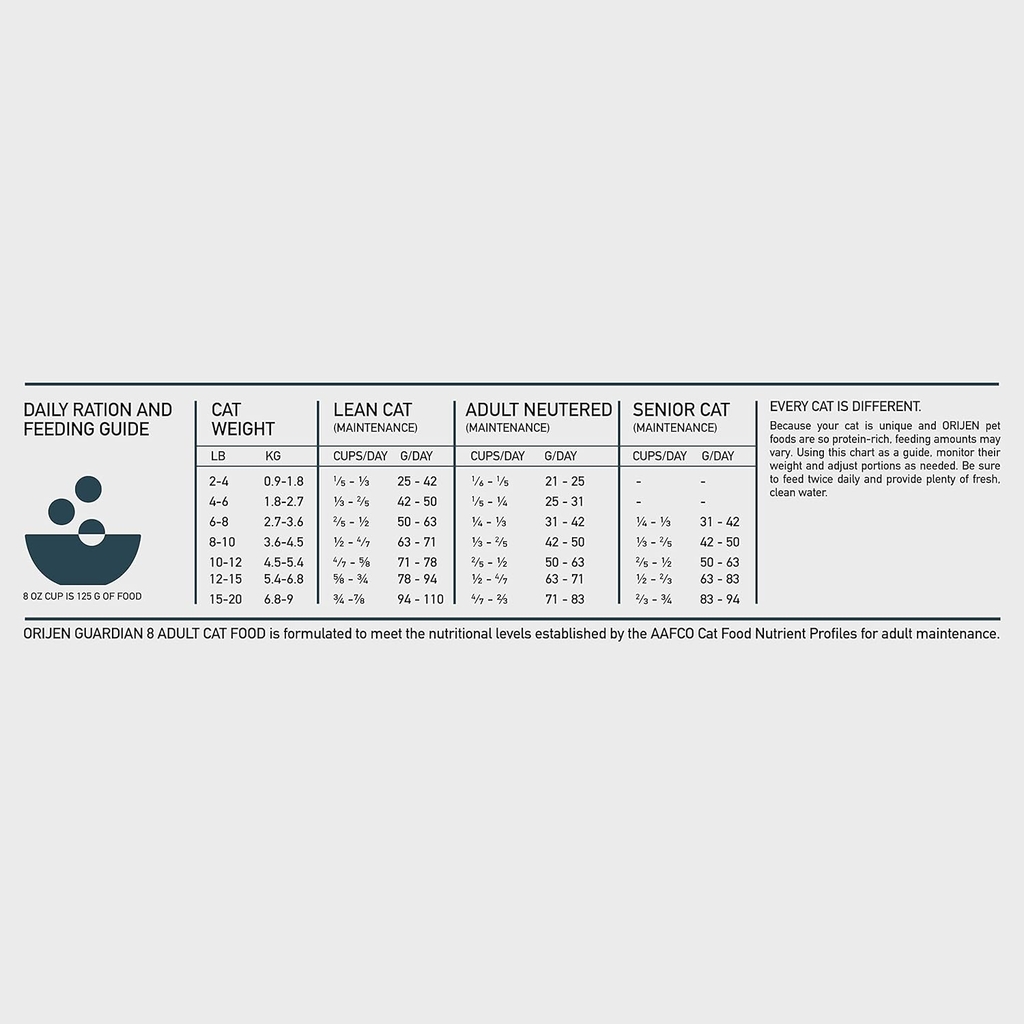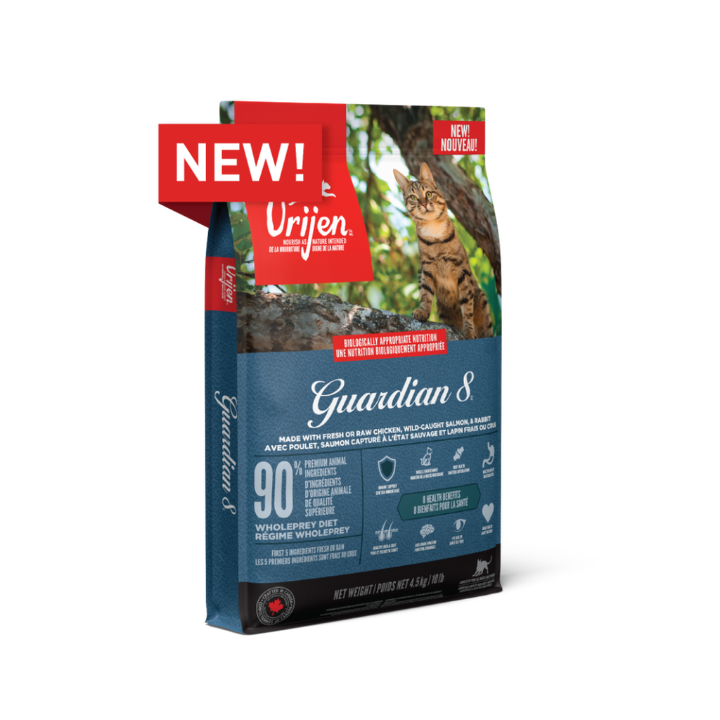 ORIJEN ® Guardian 8 là thực phẩm bổ dưỡng được chế tạo đặc biệt để giải quyết 8 mối lo ngại thường gặp của mèo thông qua các thành phần chất lượng. Do có rất nhiều thành phần động vật WholePrey tươi và thô trong chế độ ăn này nên cần ít chất bổ sung hơn để hỗ trợ sức khỏe suốt đời cho mèo của bạn. Với 90% thành phần động vật cao cấp và 2/3 trong số đó là nguyên liệu tươi sống, Guardian 8 chứa các thành phần dinh dưỡng giúp hỗ trợ sức khỏe tổng thể cho mèo của bạn với 8 lợi ích. Những lợi ích này bao gồm hỗ trợ miễn dịch, hỗ trợ sức khỏe tiêu hóa, hỗ trợ làn da và áo khoác khỏe mạnh, duy trì cơ bắp, sức khỏe tim mạch, sức khỏe khớp, chức năng não & nhận thức và sức khỏe của mắt.