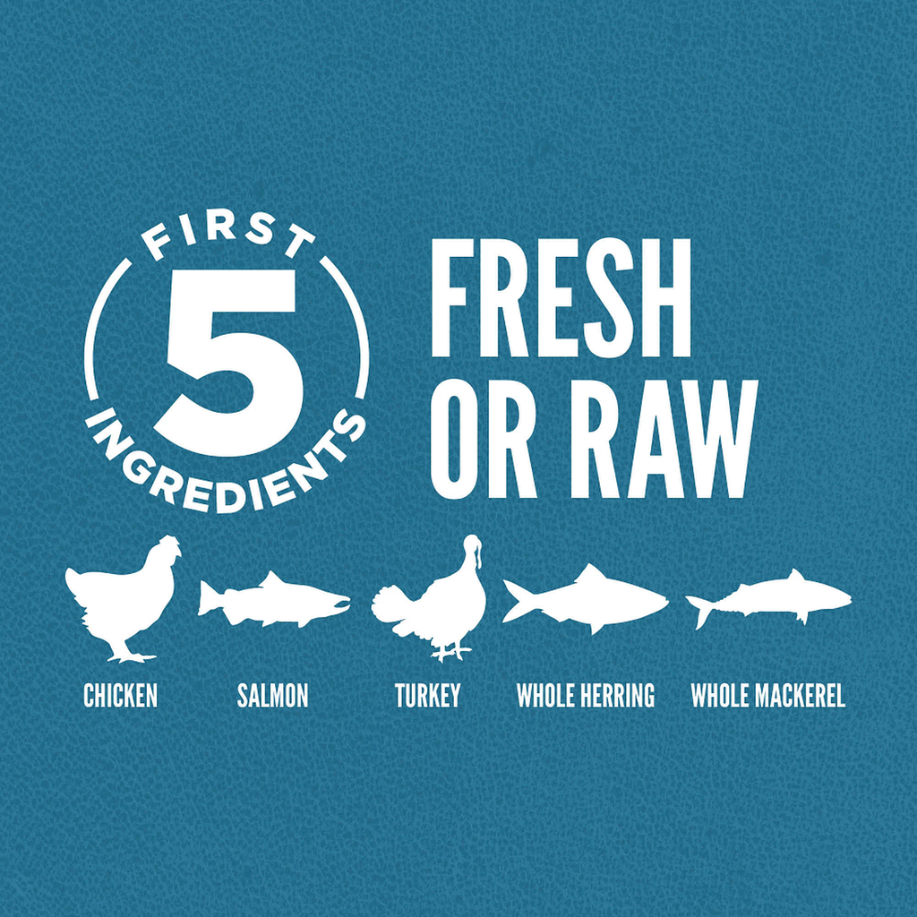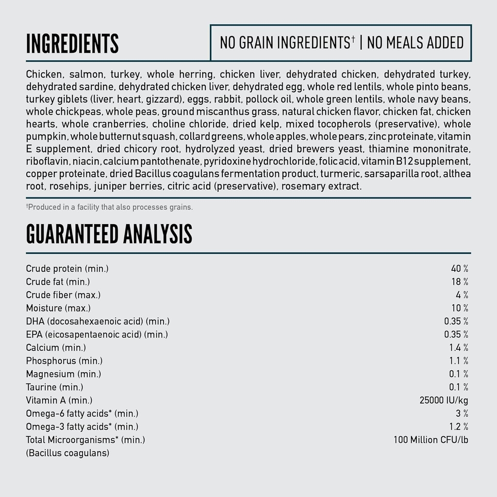 Thịt gà tươi (32%), cá hồi sống (5%), gà tây sống (5%), cá trích nguyên con sống (5%), cá thu nguyên con sống (5%), nội tạng gà tươi (gan, tim) (4,5%), gan gà tây sống (4%), trứng tươi (4%), thịt gà khử nước (4%), gà tây khử nước (4%), cá trích khử nước (4%), gan gà khử nước (4%), trứng khử nước (4%) , thỏ sống (4%), đậu lăng đỏ nguyên hạt, đậu pinto nguyên hạt, đậu lăng xanh nguyên hạt, đậu xanh nguyên hạt, đậu xanh nguyên hạt, đậu Hà Lan nguyên hạt, tinh bột đậu, cỏ miscanthus, dầu cá minh thái (1%), mỡ gà (0,5%), bí ngô tươi nguyên quả, bí đỏ tươi nguyên quả, tảo bẹ khô, rễ rau diếp xoăn khô, táo tươi nguyên quả, cà rốt tươi nguyên quả, lê tươi nguyên quả, bí xanh tươi nguyên quả, men bia khô, men thủy phân, củ cải xanh tươi, cải xoăn tươi, rau bina tươi, tươi rau củ cải, quả nam việt quất nguyên quả, quả việt quất nguyên quả, quả saskatoon nguyên quả, rễ cây ngưu bàng, hoa oải hương, rễ marshmallow, cây kế sữa, hoa hồng dại, nghệ.