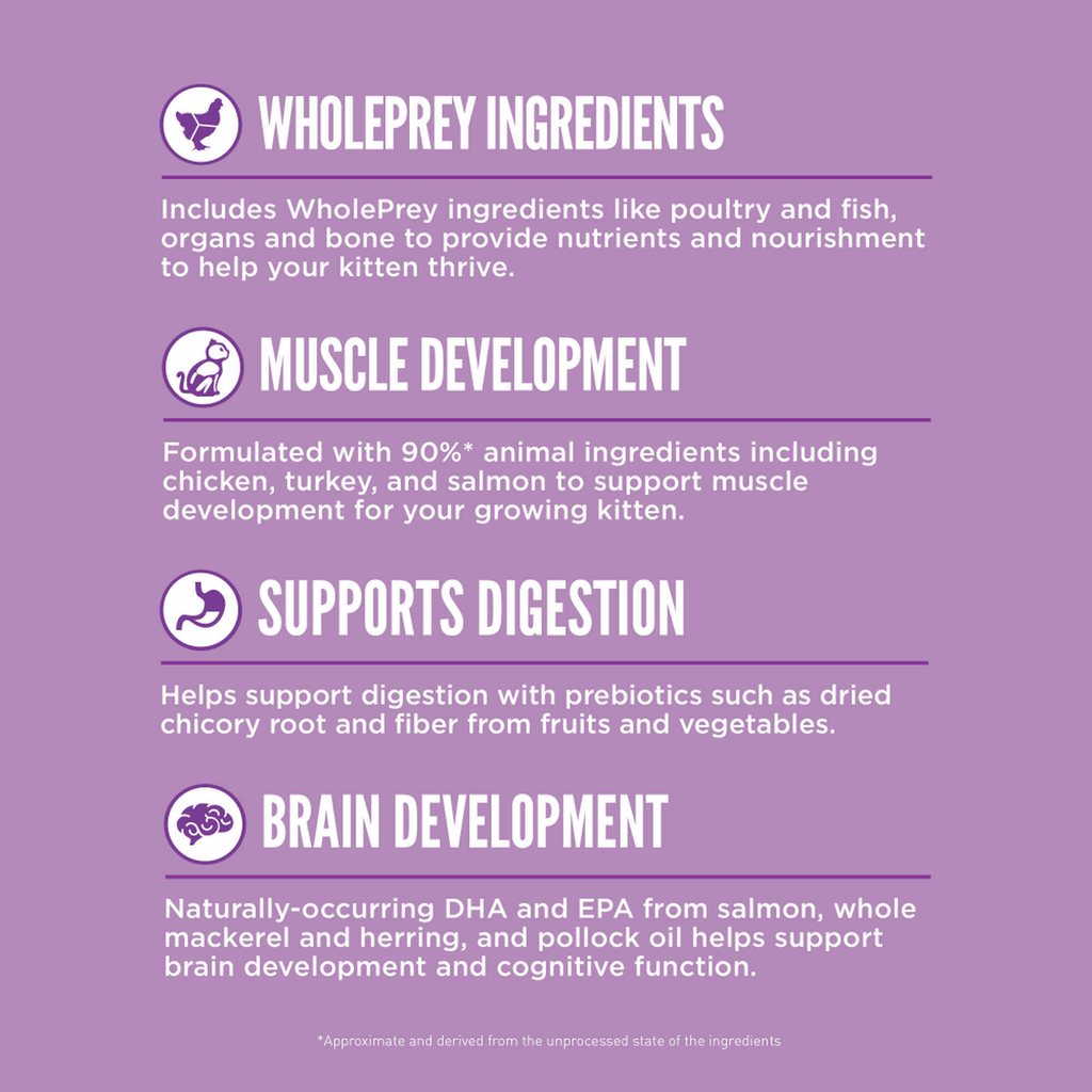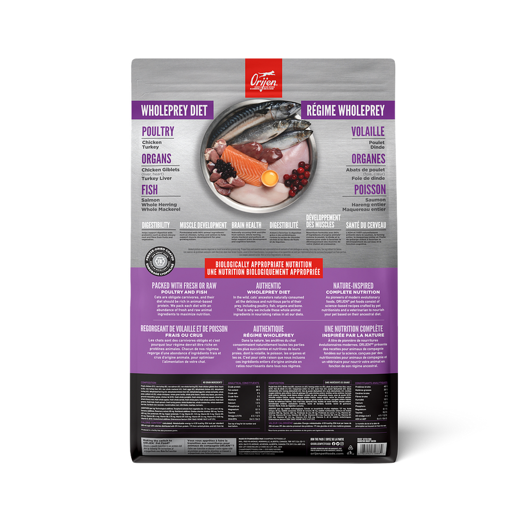ORIJEN ® Kitten được thiết kế đặc biệt cung cấp cho mèo con của bạn những dinh dưỡng cần thiết để phát triển khỏe mạnh. Chứa 90%* thành phần động vật cao cấp như thịt gà, gà tây và cá hồi, ORIJEN Kitten giúp hỗ trợ sự phát triển cơ bắp ở chú mèo con đang lớn của bạn. Sản phẩm chứa 15 nguyên liệu tươi hoặc sống, bao gồm các nguyên liệu WholePrey như thịt cơ, nội tạng và xương, những phần tươi ngon và bổ dưỡng nhất của các nguyên liệu. Chế độ ăn này giúp hỗ trợ sự phát triển trí não và chức năng nhận thức của mèo con với DHA và EPA tự nhiên từ cá hồi, cá thu và cá trích nguyên con cũng như dầu cá minh thái. Mèo con của bạn sẽ phát triển mạnh khi bạn cho chúng ăn protein động vật tươi sống mà chúng cần.