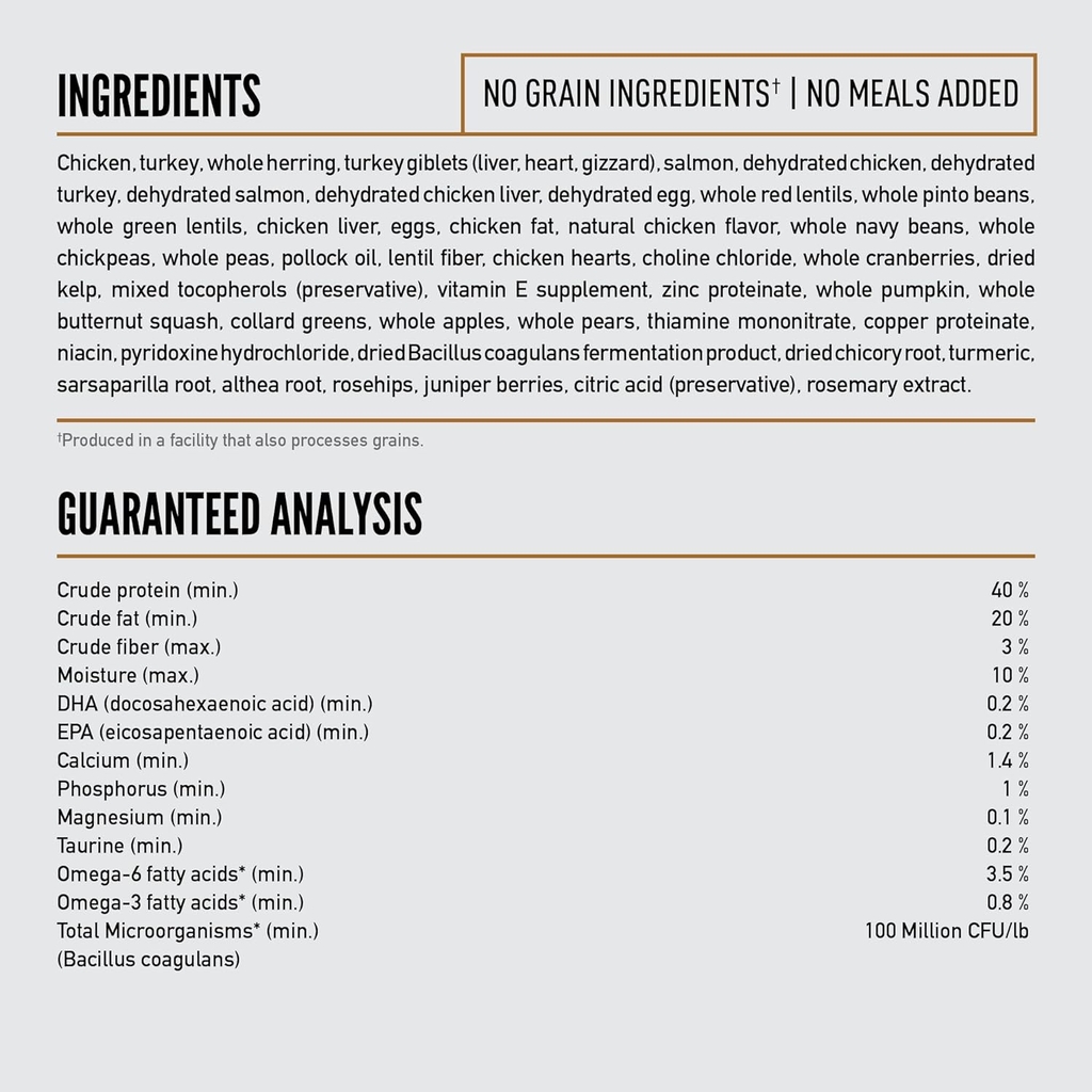 Thịt gà tươi (20%), gà tây sống (10%), cá trích nguyên con sống (9%), lòng gà tươi (gan, tim) (6%), cá tuyết nguyên con sống (5%), gan gà tây sống (5%) , trứng tươi (5%), thịt gà khử nước (4%), gà tây khử nước (4%), cá thu khử nước (4%), cá mòi khử nước (4%), cá trích khử nước (4%), mỡ gà (4%), đậu lăng đỏ nguyên hạt, đậu Hà Lan nguyên hạt, đậu lăng xanh nguyên hạt, đậu xanh nguyên hạt, sợi đậu lăng, đậu pinto nguyên hạt, tinh bột đậu, đậu xanh nguyên hạt, dầu cá minh thái (1%), tảo bẹ khô, bí ngô tươi nguyên quả, bí đỏ nguyên hạt tươi, bí xanh tươi nguyên quả , cà rốt tươi, táo tươi, lê tươi, rễ rau diếp xoăn khô, cải xoăn tươi, rau bina tươi, củ cải xanh tươi, củ cải xanh tươi, quả nam việt quất nguyên quả, quả việt quất nguyên quả, quả saskatoon nguyên quả, nghệ, cây kế sữa, rễ cây ngưu bàng, hoa oải hương , rễ marshmallow, hoa hồng dại.