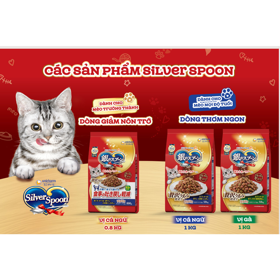 Hạt Silver Spoon Mèo là sản phẩm thức ăn cho mèo được sản xuất bởi thương hiệu Silver Spoon của Unicharm Nhật Bản. Sản phẩm được đánh giá là số 1 về độ ngon miệng tại Nhật Bản trong suốt 5 năm liên tiếp.