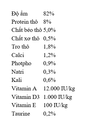 Thành phần của sản phẩm được lựa chọn kỹ lưỡng, đảm bảo cung cấp đầy đủ các chất dinh dưỡng cần thiết cho mèo, bao gồm: