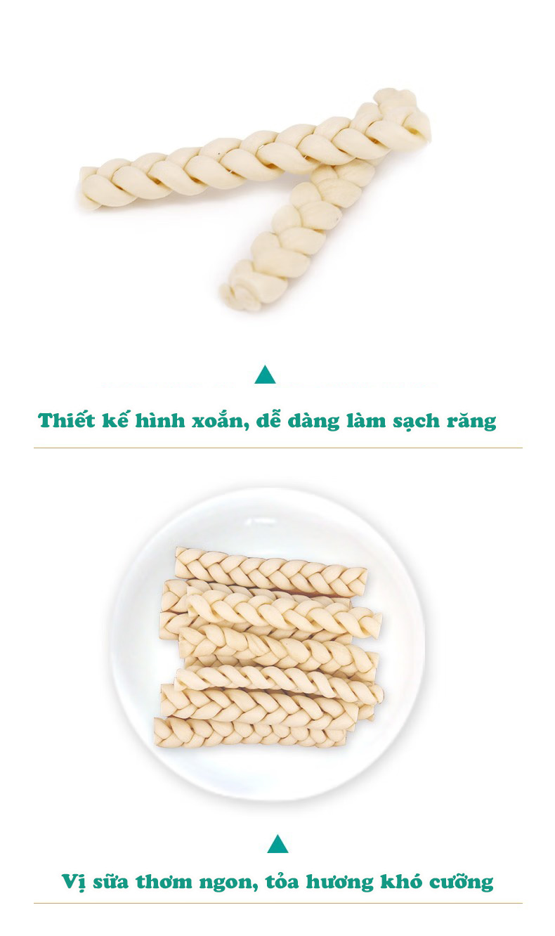 - Cấu tạo xoắn đôi, giúp chó nhai lâu, tăng cường sức khỏe răng hàm.