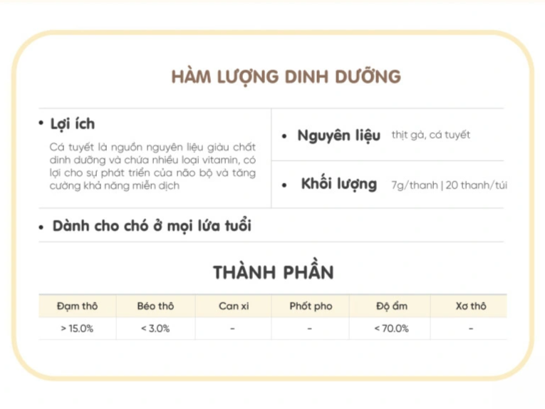 Thành phần: Thịt gà, thịt cá tuyết, bột ngũ cốc, D-Sorbitol, đạm đậu nành.